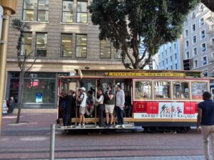 サンフランシスコの観光用の乗り物で有名なケーブルカー。外に人が乗ってる!と驚いた様子でした。
