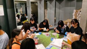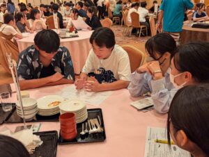 (写真は、夕食後に下書き案を練る生徒たちの様子です。)