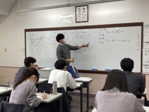 同じ時間、高3の教室でも「グラフの面積」を求めていました。 しかし、中1がグラフ上の直線からなる面積を扱うのに対し、受験生が向き合うのは曲線。「積分」を駆使して、より複雑な領域を鮮やかに切り出していきます。