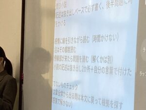 中1の教室では、模試や高校入試でも頻出の「グラフ上の面積」に取り組んでいました。 難しい問題が続く中、授業の合間にはこんなアクティビティも。